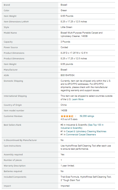 Overall, the BISSELL Little Green Multi-Purpose Portable Carpet and Upholstery Cleaner, 1400B seems to be a useful and practical cleaning solution for those who need a portable and versatile cleaner for everyday messes and spills.