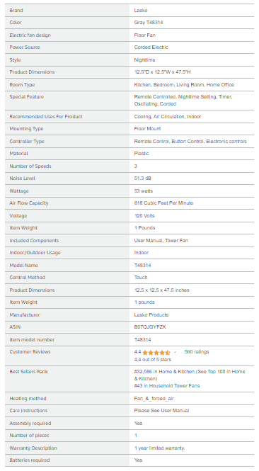 Overall, the Lasko Portable Electric Oscillating Stand Up Tower Fan, 48″, Gray T48314 appears to be a good option for those looking for a powerful and convenient tower fan with a variety of features. However, as with any product, it’s important to consider both the pros and cons and read customer reviews before making a purchase decision.
